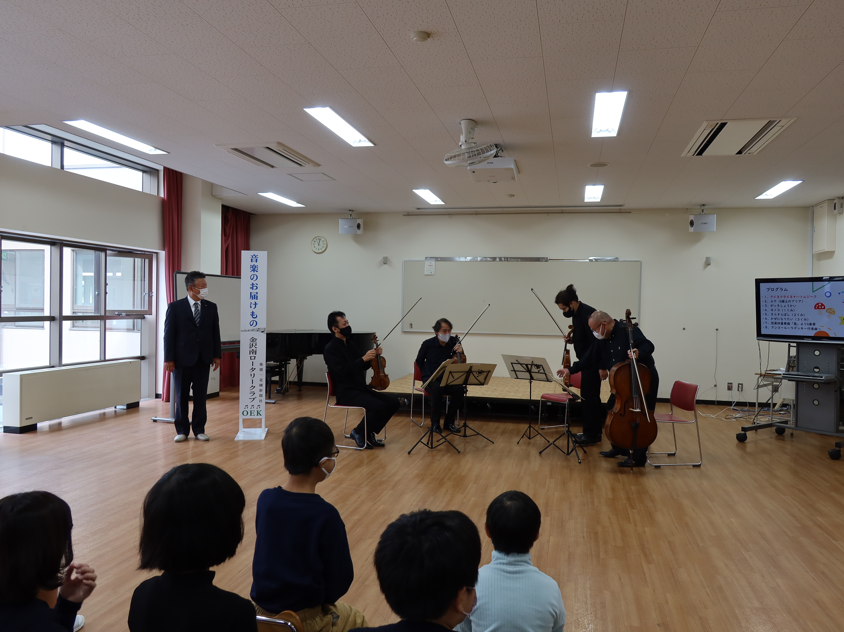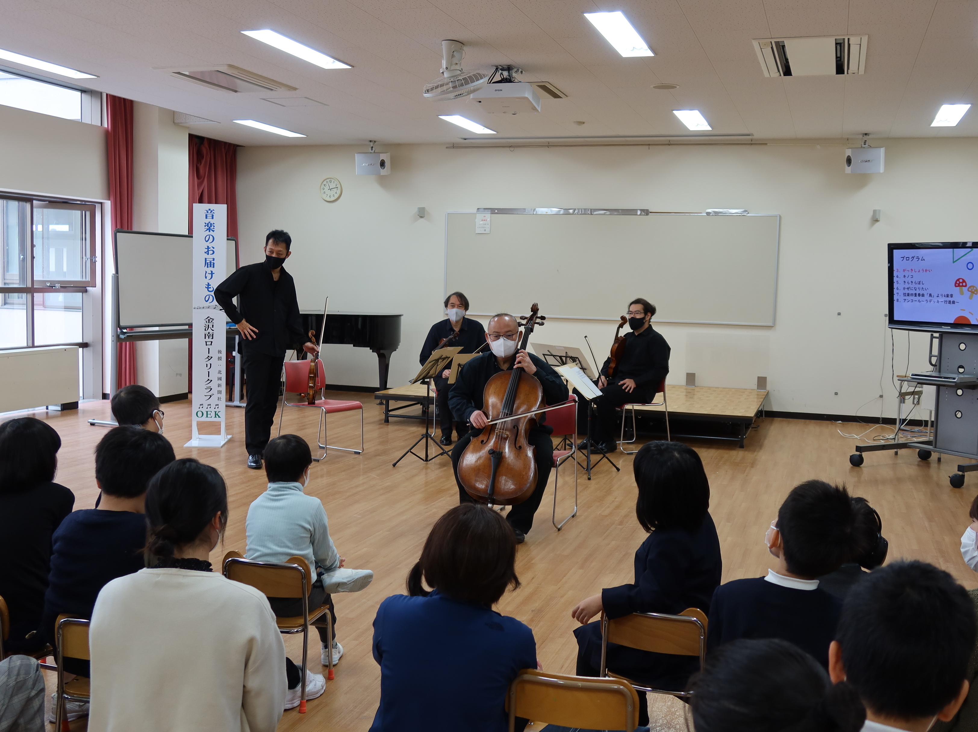 演奏会では、オーケストラアンサンブル金沢の弦楽四重奏を楽しみ、「風になりたい」では、児童も打楽器をたたき一緒に演奏を楽しみました。